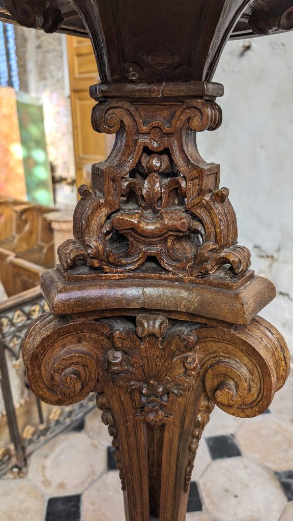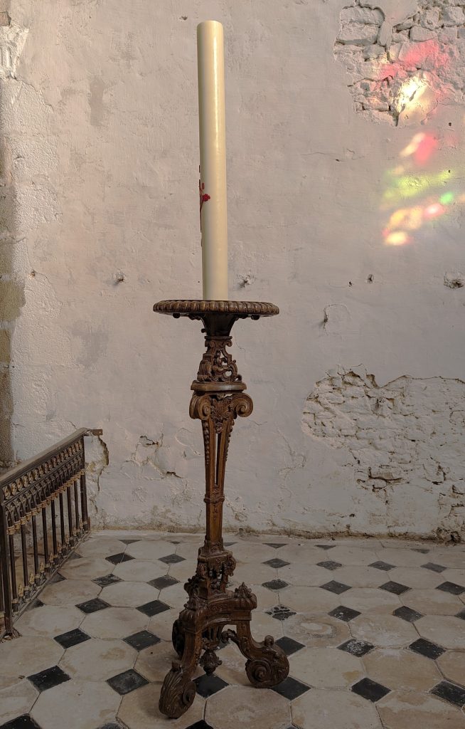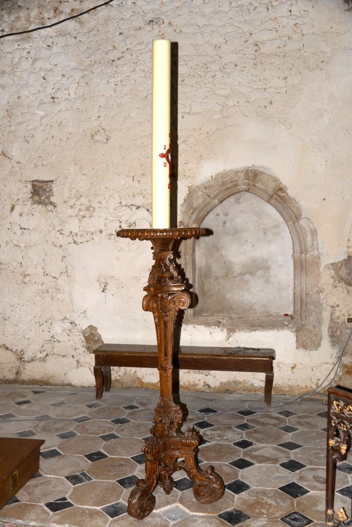 On remarque aussi la piscine liturgique creusée dans le mur